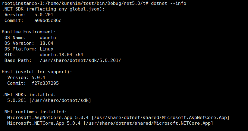 다 깔고 나면 dotnet --info 명령어를 통해서 잘 깔렸는지 볼 수 있다. 아래 사진에서는 현재 최신버전인 5.0이 설치된 것을 볼 수 있다.