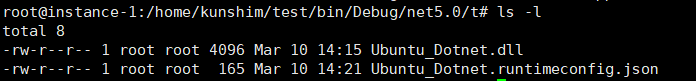 현재까지 과정을 따라했다면 폴더에 다음과 같이 dll과 json 두개의 파일이 남아있을 것이다. 여기서 dotnet Ubuntu\_Dotnet.dll 로 실행을 하면 에러가 뜬다. 따라서 json의 수정이 필요하다.