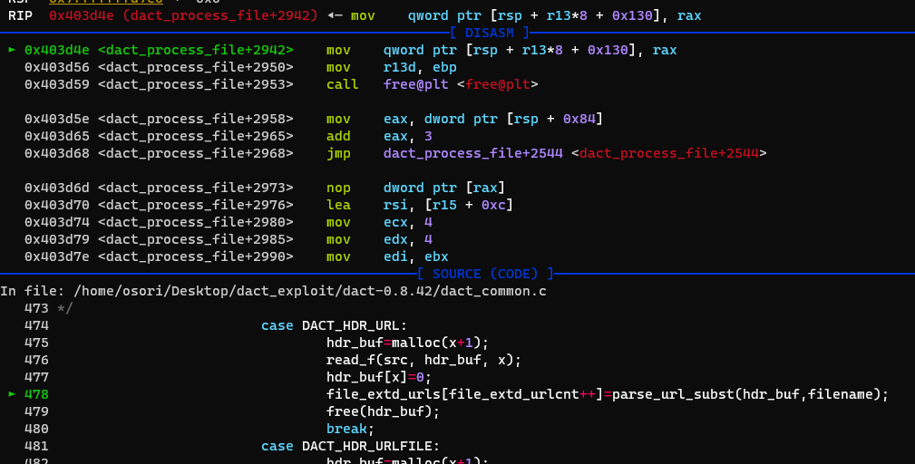 input으로 crash_file 을 주었을 때 dact_common.c 의 478번째줄에서 file_extd_urlent++ 가 계속 되면서 접근할 수 없는 주소로 접근을 해버린다. 그리고 file_extd_urls는 char*[256]의 자료형이다. 즉 file_extd_urlent 가 256이 넘어가면 sfp,ret에 접근이 가능해서 원하는 곳으로 점프가 가능하다는 것이다. 저 parse_url_subst 함수가 어떻게 작동하는지는 잘 모르지만, 만약 여기서 ROP가 가능하다면 그냥 exploit이 가능하다는 것이다.