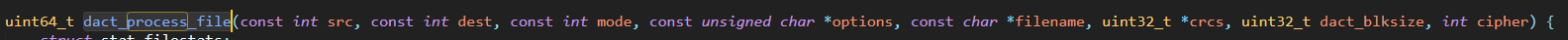일단 인자를 보면 대강 알겠지만, 첫번째 인자는 filename 이름의 file을 openat으로 열어서 얻은 fd이다. 두번째 인자는 output으로 생성할 파일의 fd이고, 3번째 인자는 잘 모르겠고 , 5번째 인자는 crc라고 되있는거 보면 체크섬같이 검사하는 용도인 것 같고, 6번째는 blocksize , 7번째는 cipher라니까 암호랑 관련있는건데 어떤 암호알고리즘을 쓸지 정하는 것이라고 대강 유추가 가능하다.
