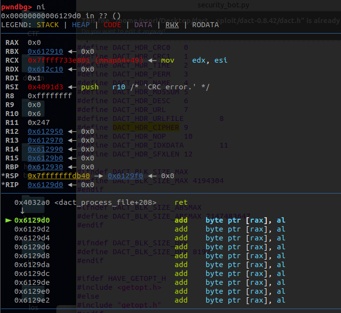 dact 뭐 파일 압축을 해주는 놈인데 afl fuzzer를 이용해서 fuzzing 을 하고 이 dact를 exploit 해서 쉘을 얻어내는 것이 목표다. 일단 처음 시작은 어디서 어떻게 segmentation fault가 떴는지였다.