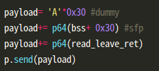 처음 페이로드이다. bss영역 +0x30을 준 이유는 read로 읽는 부분이 rbp-0x30이기 때문에 rbp가 bss로 이동을 하게되면 bss-0x30으로 bss영역이 아닌 엉뚱한 곳에 쓰게 되기 때문이다. 그리고 read_leave_ret은 두번째 페이로드 작성을 위해서 이다. 이 가젯은 프로그램 마지막에 read_leave_ret이 실행되기 때문에, 그 부분 주소를 가지고 오면 된다.