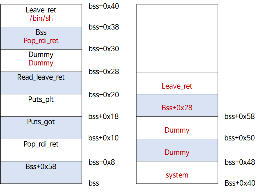 그렇다면 read 함수에 어떻게 값을 넣어줘야 할까? 지금 우리가 이 스택피벗을 하는 이유는 근본적으로 공간이 부족해서 이다. 즉, rip가 buf의 시작부분을 가르키게 하고 싶다는 것이다. 그렇다면 rbp에 bss의 주소를 넣어주고 rip에 leave_ret 가젯을 넣어준다면 leave에 의해서 rsp는 rbp와 같이 buf맨 아래(bss)로 내려오고 bss+0x8로 rsp가 이동, ret에 의해서 bss+0x8로 rip가 이동, bss+0x10으로 rsp가 이동할 것이다.