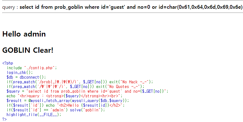 no 구문에는 따옴표가 없기때문에 그냥 쓰는게 바로 sql구문으로 들어감. 여기서 한가지 알아낸점이 있는데 원래라면 id='admin'으로 해야된다. ''가 문자열이라고 나타내주기 때문에 그런데 hex나 char을 쓰면 따옴표가 없어도 문자열로 인식이 되는 것 같다. 이걸 모르고 따옴표까지 char에 포함시켜서 삽질했다.