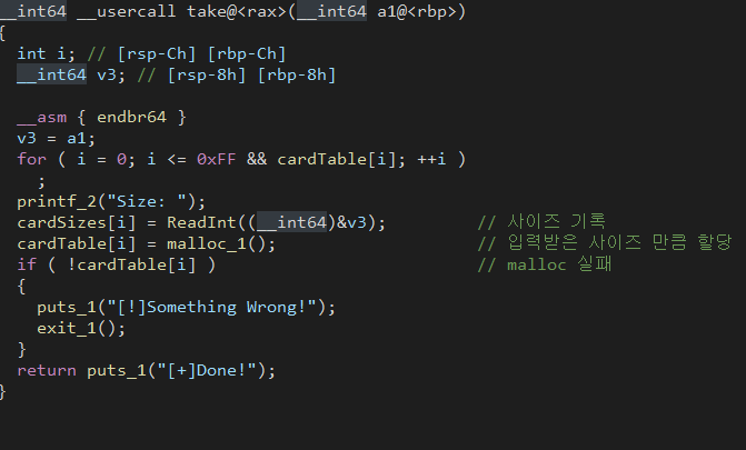 단순하게 사이즈를 입력받고 bss영역에 있는 cardSizeTable에 사이즈를 저장하고 malloc으로 입력한 사이즈 만큼 할당을 받는다.