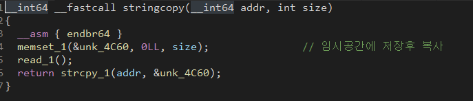 인자가 다 깨져서 보이지만 read(0,&unk_4c60,size) 이다.