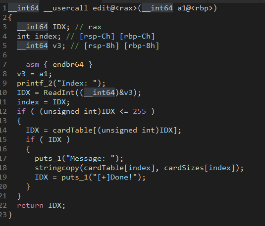 그러나 전역변수 내용 전체를 memset 하는 것이 아닌, 현재 card의 사이즈만큼 memset하기 때문에 이전에 큰 사이즈를 edit했으면 남아있는 내용도 같이 strcpy될 수 있다.