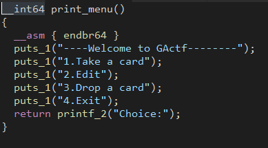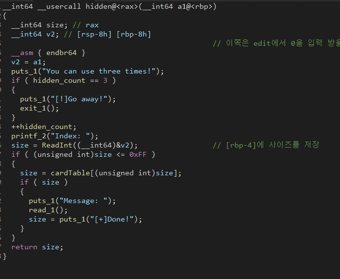 왜 갑자기 4를 넘기고 5가 됬냐 하면 4는 exit이기 때문이다. 신기하게도 5를 입력하면 숨겨진 메뉴로 이동하는데, 딱히 취약점이 있는 함수는 아니다. edit에서는 strcpy이기 때문에 NULL문자를 중간에 삽입 할 수 없는데 이곳은 가능하다.