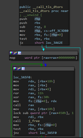 exit 함수는 시작할 때 바로 __call_tls_dtors를 호출하는데 보통은 여기서 rbx가 0이기 때문에 밑의 과정들을 실행하지 않는다. 그러나 인자들을 잘 구성해서 밑의 과정이 실행되면 j_free에서 free가 호출된다.
