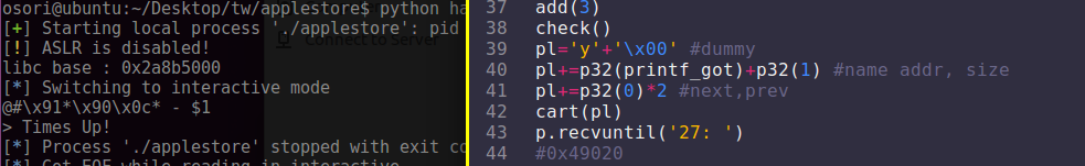 이 부분에서 한번 더 조심해야 하는 것이, 저 스택청크 부분은 계속 사용이 되는 부분이기 때문에 한변 변조한다고 그대로 남아있는 것이 아니다. 따라서 y+null + printf got + size + null +null 로 cart에 payload를 보내줘야 한다.